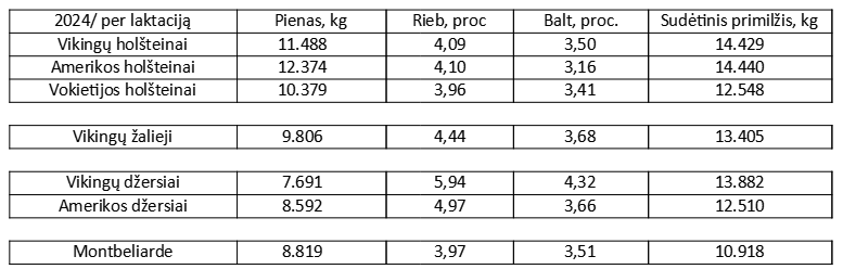 Vikingų holšteinai pagal 2024 metų duomenis vidutiniškai davė 11.488 kg pieno (4,09 proc. riebumo ir 3,50 proc. baltymingumo). Perskaičiavus šį produktyvumą pagal Lietuvos pieno supirkimo taisykles sudėtinis primilžis būtų 14.429 kg.